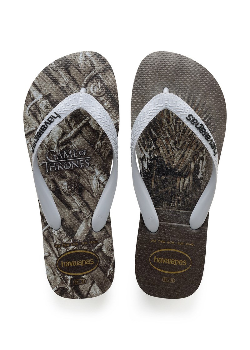 Πάγος και φωτιά συνδυάζονται στο ζευγάρι με τα οικόσημα των Σταρκ και των Ταργκάριεν ενώ οι λάτρεις της σειράς θα νιώσουν ετοιμοπόλεμοι με ένα ζευγάρι Havaianas με τους χάρτες των περιοχών Γουέστερος και Έσος. Αυτοί που θέλουν να κυριαρχήσουν τα Επτά Βασίλεια θα λατρέψουν το ζευγάρι που απεικονίζει τον πολυπόθητο Σιδερένιο Θρόνο.