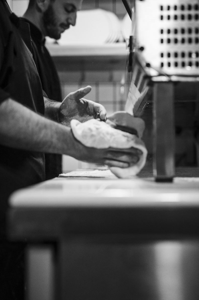 Στην κουζίνα, η ομάδα του Σιμιλλίδη ετοιμάζει ζυμάρια για τις πίτσες.