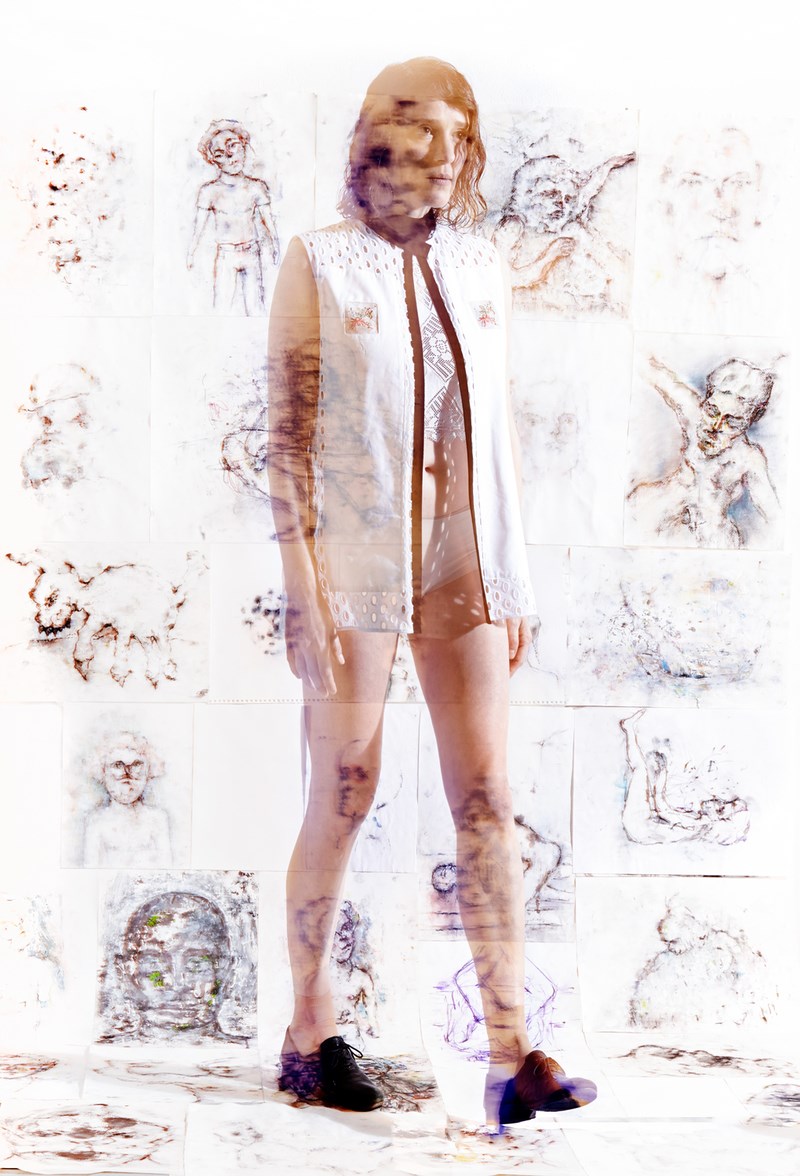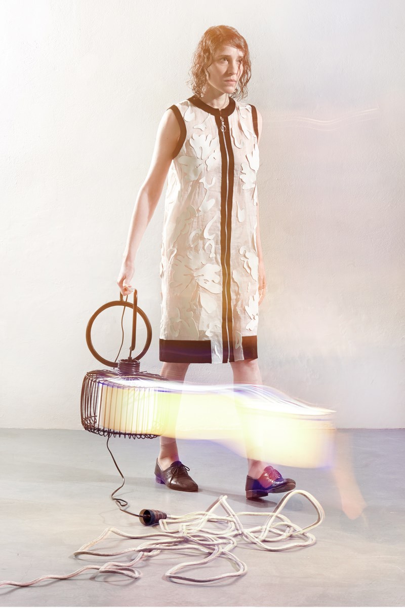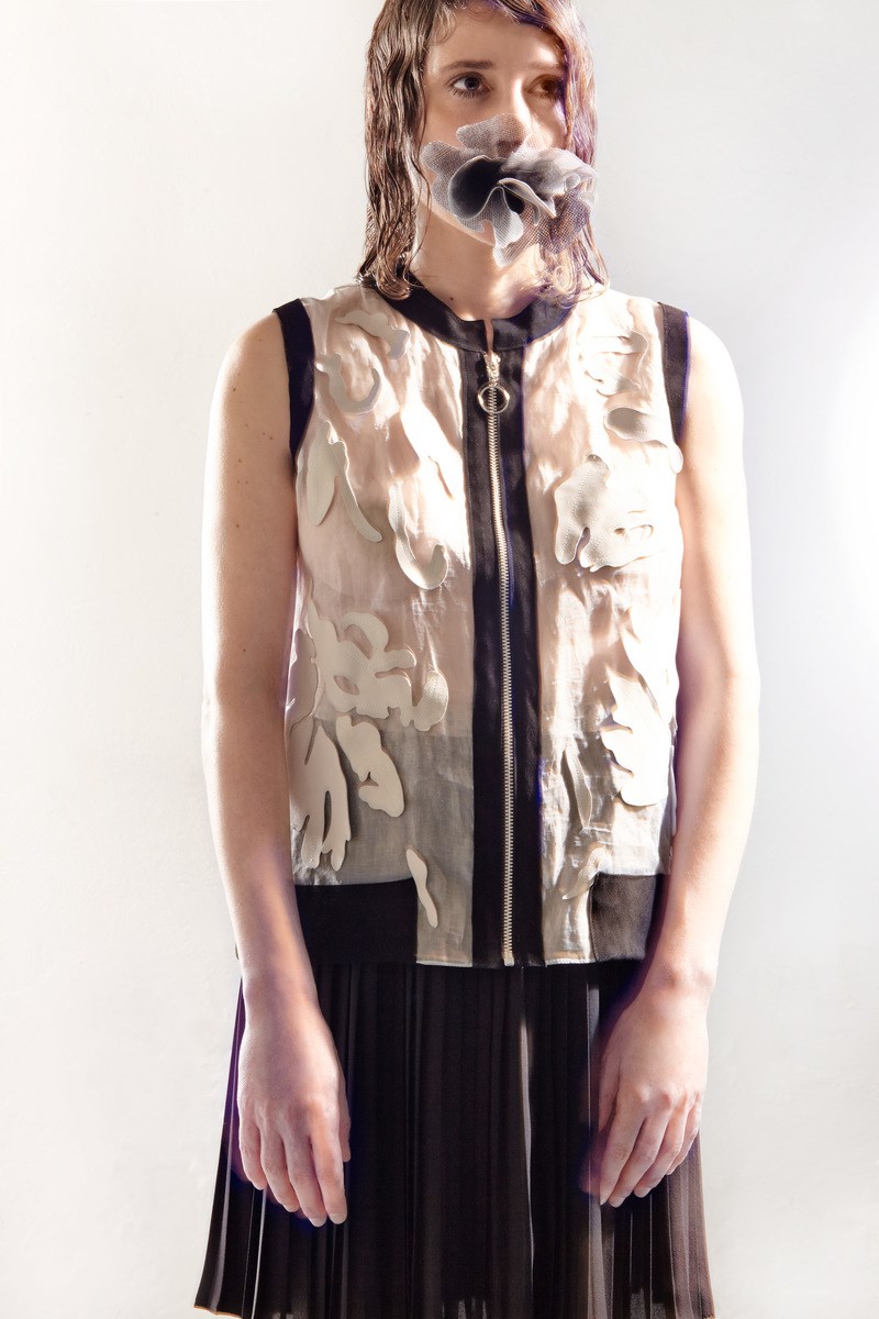 κομμάτι ύφασμα, σε ένα ρετάλι από δέρμα ή μια παλιά δαντέλα. Κοιτάζω ένα ένα τα όνειρά της να κρέμονται στο stand και ανακαλύπτω εκ νέου τη γοητεία που μπορεί να έχει το παλιό σεμέν της γιαγιάς όταν μεταμορφώνεται σε θηλυκό τοπ, με απλές γραμμές και δυναμικές λεπτομέρειες από δέρμα.
