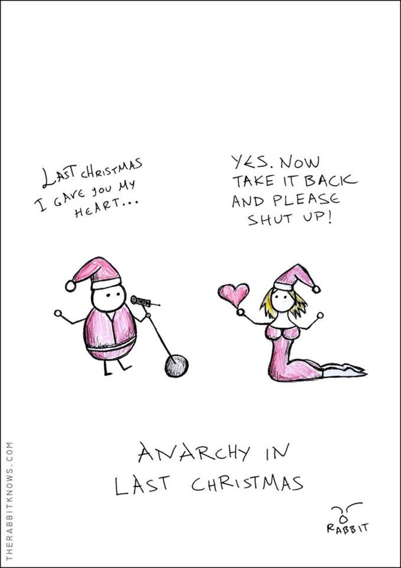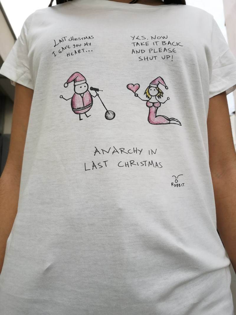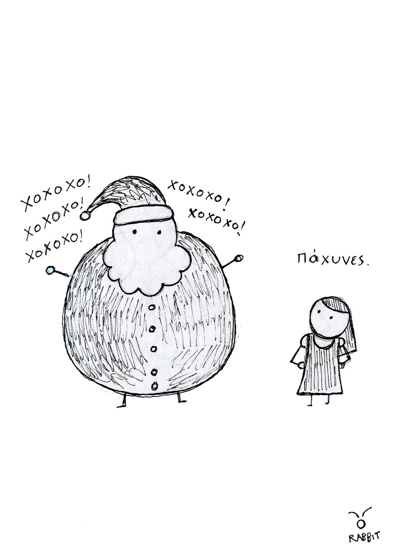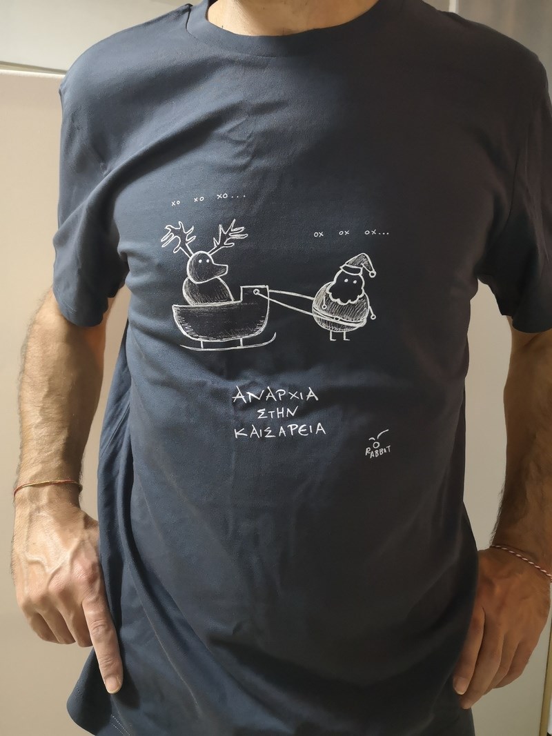 «To Anarchy in Christmas είναι μια συλλογή των αντίστοιχων σκίτσων με θέμα τα Χριστούγεννα. Γενικά όλες οι συλλογές φτιάχνονται κάπως ανάποδα. Δηλαδή δεν αποφασίζω να φτιάξω μια συλλογή με ένα συγκεκριμένο θέμα. Σχεδιάζω αυτά που θέλω και κατά περιόδους κοιτάζω πίσω και ομαδοποιώ κάποια σκίτσα με κοινή θεματική. Η συγκεκριμένη σειρά αναπτύχθηκε παραπάνω μέσω της πολύ όμορφης συνεργασίας μου με το It's all oh! so souvenir to me. Τώρα για τα Χριστούγεννα τι να πρωτοπούμε; Eίναι ωκεανός ευκαιριών για χιούμορ, και γενικότερη αγάπη και βλακεία. Ο χιονοπόλεμος που κάποτε πρέπει να ακολουθηθεί και από χιονοειρήνη, ο Ρούντολφ που επαναστατεί, το λαστ κρίστμας, ΤΟ ΑΤΙΜΟ ΤΟ ΛΑΣΤ ΚΡΙΣΤΜΑΣ, και φυσικά ο γνωστός Άγιος με τα κόκκινα που παχαίνει ασταμάτητα. Όρεξη να έχουμε να λέμε χαζομάρες. Και έχουμε μπόλικη».