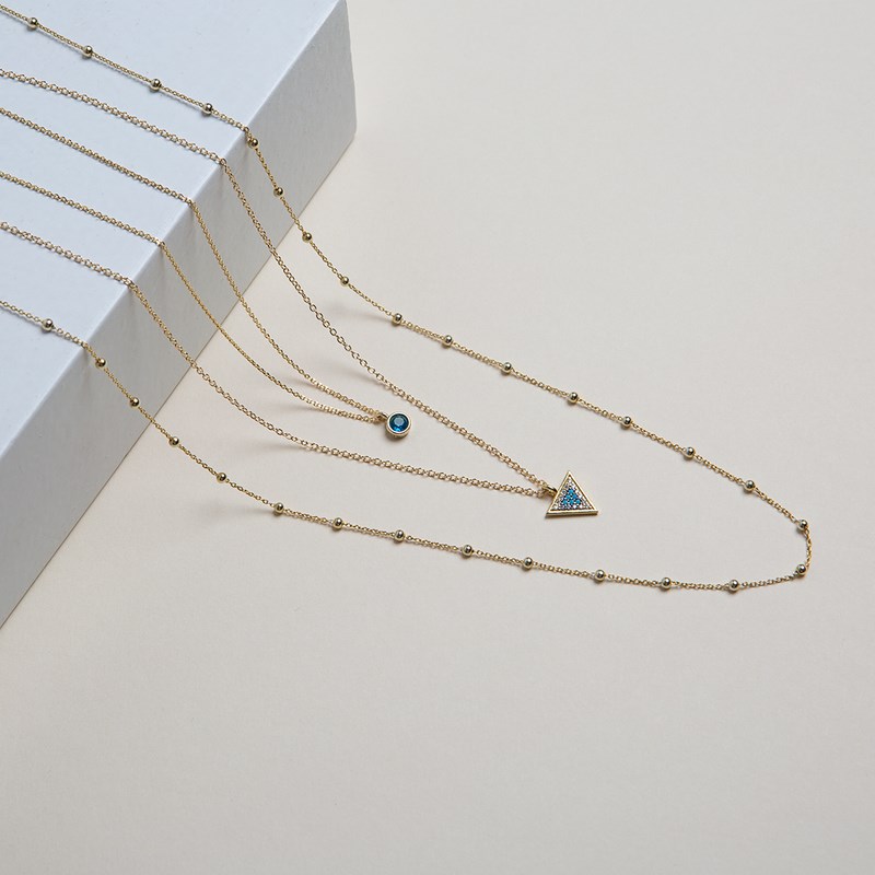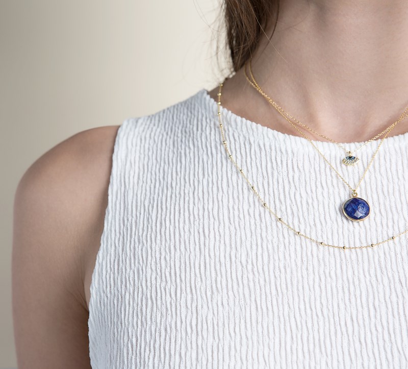 Η παραλία θέλει mix ‘n’ match. Μικρά κρικάκια στην απόχρωση του χρυσού συνδυασμένα με vintage layering από επίχρυση gourmet αλυσίδα μαζί με επίχρυσο φλουρί, τύπου «κωνσταντινάτο».