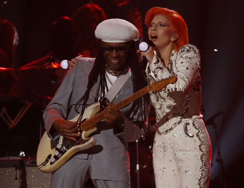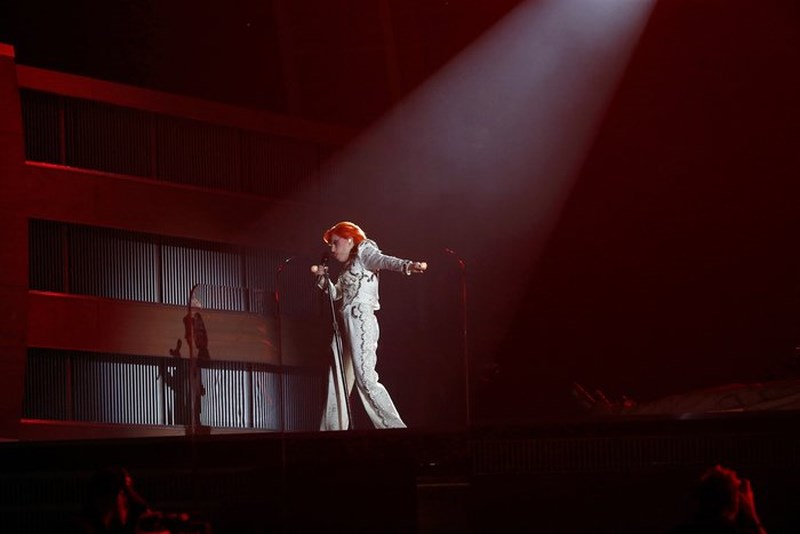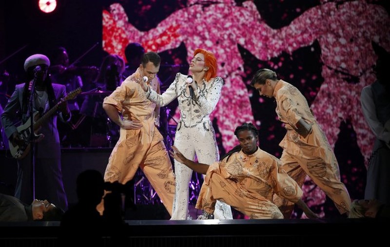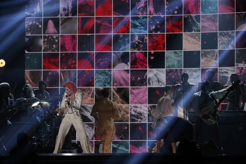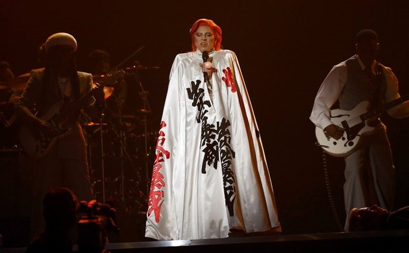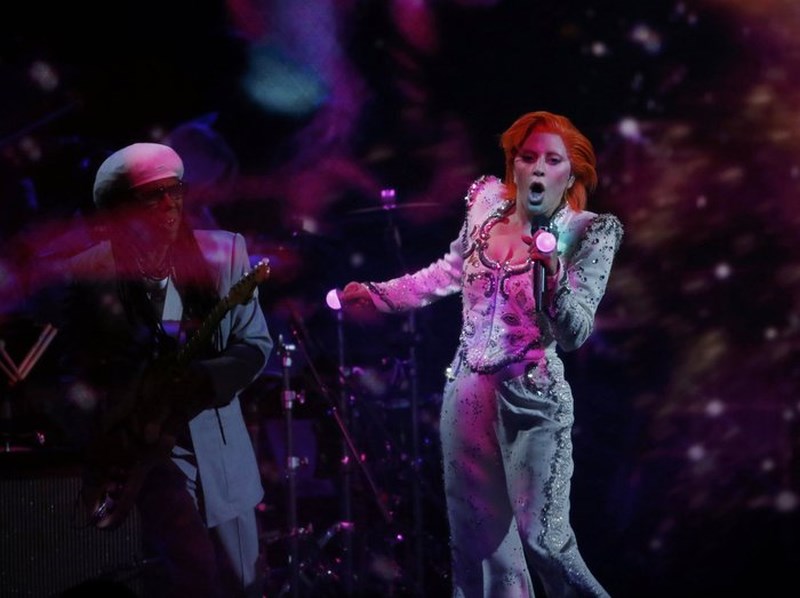 Χτες το βράδυ έγινε και πάλι το Νο1 θέμα συζήτησης στον πλανήτη, όταν εμφανίστηκε ως David Bowie, με πορτοκαλί μαλλία και υπέροχα ρούχα στη σκηνή των Grammy, τραγουδώντας με μοναδικό τρόπο τις μεγαλύτερες επιτυχίες του θρύλου της ροκ -Changes, Ziggy Stardust, Suffragette City, Rebel Rebel, Let’s Dance και Heroes - με τη βοήθεια πληθώρων γραφικών και τεχνολογικών μέσων που βοήθησαν τη μεταμφίεσή της.